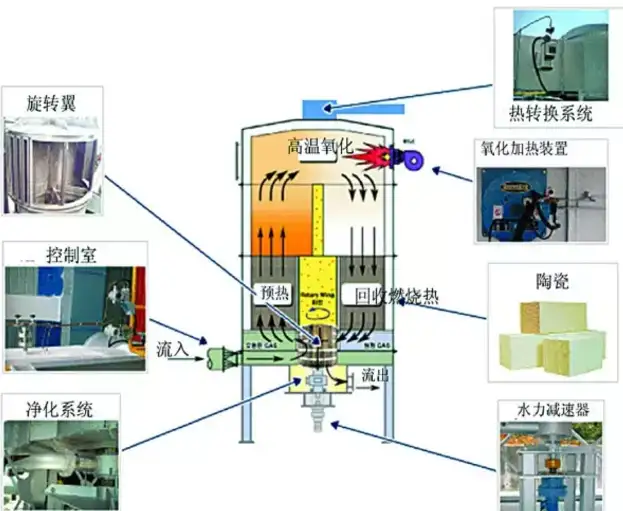 旋转式RTO进行废气处理时,需要对某些废气成分进行去除,去除采用吸附法或过滤法,将旋转式RTO不能处理的废气成分如二氧化氮、二氧化硫、硫化氢、氨气等有毒有害气体吸收或者采用玻璃纤维过滤的方法对旋转式RTO有害的油雾、酸雾过滤去除,将预处理后的有机废气导入旋转式RTO设备中焚烧,在高温下氧化分解,将有机废气转化为无毒无害的二氧化碳和水,净化后的洁净气体通过烟囱高空达标排放。