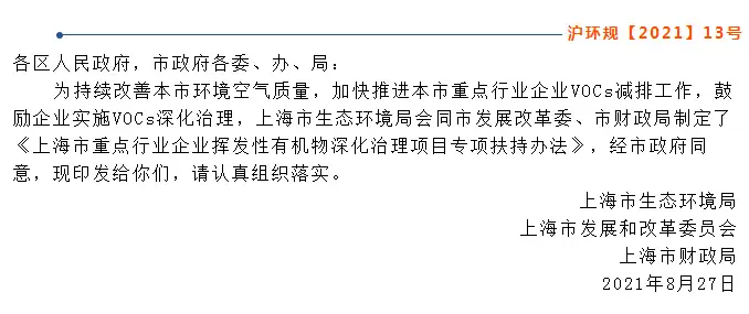 为贯彻落实《上海市清洁空气行动计划(2018-2022年)》(沪府办发〔2018〕25号)和上海市生态环境局《关于开展本市重点行业挥发性有机物综合治理工作的通知》(沪环气〔2020〕41号,以下简称《通知》),加快推进本市重点行业企业挥发性有机物(以下简称VOCs)减排工作,鼓励企业实施VOCs深化治理,持续削减VOCs排放总量,改善环境空气质量,根据《上海市节能减排(应对气候变化)专项资金管理办法》(沪发改规范〔2021〕5号)等有关规定,制定本办法。