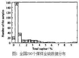 胡军等[1]对来自全国的290个煤样的全硫数据进行分析,其分布见图1,所有煤样中硫分算术平均值为1.18% ,硫分大多集中在0~1.25%范围以内。在所采集的样品中,低硫煤和超低硫煤(St<1.0%)占67.9%>2.5%)占16.2%,结果表明, 我国煤以低硫煤和超低硫煤为主,高硫煤和特高硫煤所占比例较小,这一观点与李文华[2]的研究结果基本一致,利用煤炭储量对煤中全硫含量进行加权求平均值, 得出中国煤种的全硫平均含量为0.94%,这比李文华[3]曾以《中国煤种资源数据库》为基础计算出的中国煤炭硫平均含量1.11%稍低,李瑞[4]以《中国煤种资源数据库》为基础,给出了我国不同煤种储量及其平均硫含量,通过其数据计算出全硫平均含量为0.89%,这与所计算的结果比较接近。