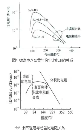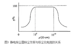如图3所示,比电阻在104Ω•cm~1010Ω•cm 之间的粉尘是静电除尘器易于收集的[5],比电阻过高或过低都较难收集。若粉尘层比电阻超过临界值1010Ω•cm时,电晕电流通过粉尘不会受限制,这将影响粉尘粒子的荷电量、荷电率和电场强度等,最终导致电除尘器效率大幅下降,同时,沉积在电极上的电荷不易释放,粉尘层中的电压降变得很大,受静电力的影响,粉尘吸附在电极上,造成电极积灰严重,也将大幅降低除尘效率。