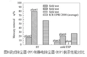 燃煤电厂脱汞是继脱硫、脱硝后成为电力行业的又一重点工作。大气环境中的汞有1/3来自燃煤电厂排放[11],若有效控制电力行业的汞排放,可以缓解燃煤汞污染问题。Pavlish等[12]引用ICR的统计数据指出,不同除尘设备即静电除尘器 CS 2ESP ( cold side ESP)和布袋除尘器FF的脱汞效率分别为27%和58%,东南大学王运军[13]等人对国内5家电厂安装布袋除尘器和静电除尘器(2台布袋和3台静电)脱汞性能进行比较,如图6所示,由此可以看出,布袋除尘器更有利于脱除烟气中的汞。