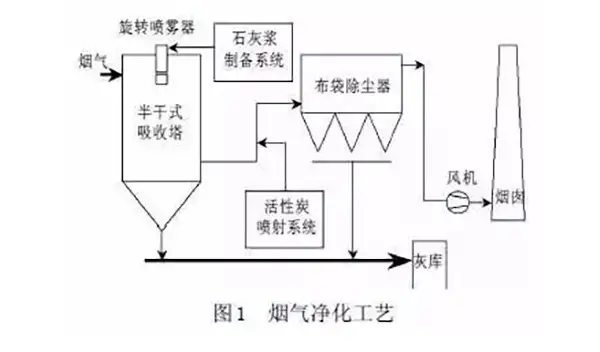 干式脱硫法投资与半干法接近,但对酸性气体的去除效果较差。半干法脱硫的特点是充分利用烟气中的余热,使吸收剂中的水分蒸发,净化反应产物以干态固体的形式排出,避免了湿法净化技术的缺点。其净化过程是将烟气从较高温度降到设定温度,并喷入碱性吸收剂,使之与烟气中的酸性气体反应,且同时得到干燥的盐类产物,再用除尘器设备加以回收。