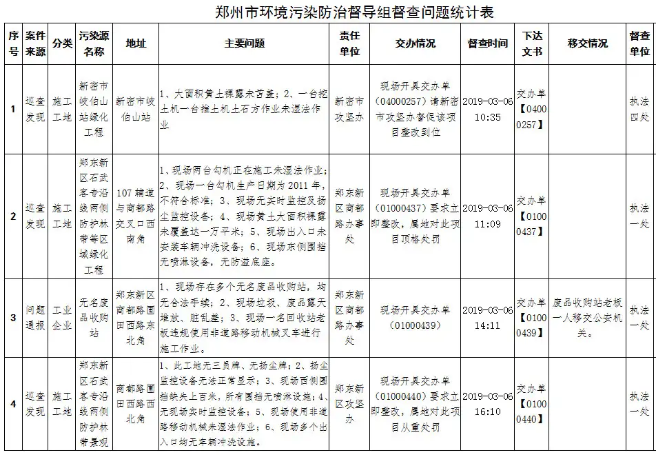 3月6日08时至3月7日08时,市环境污染防治督导组共出动7个督查组28人次,督查施工工地41家、工业企业3家,现场查处20项问题(高新区1起、惠济区2起、管城区2起、金水区3起、新密市2起、郑东新区6起、中原区4起),其中施工工地18家、工业企业1家、车辆1辆,开具交办单7份。移交公安机关3起,拟行政拘留4人。